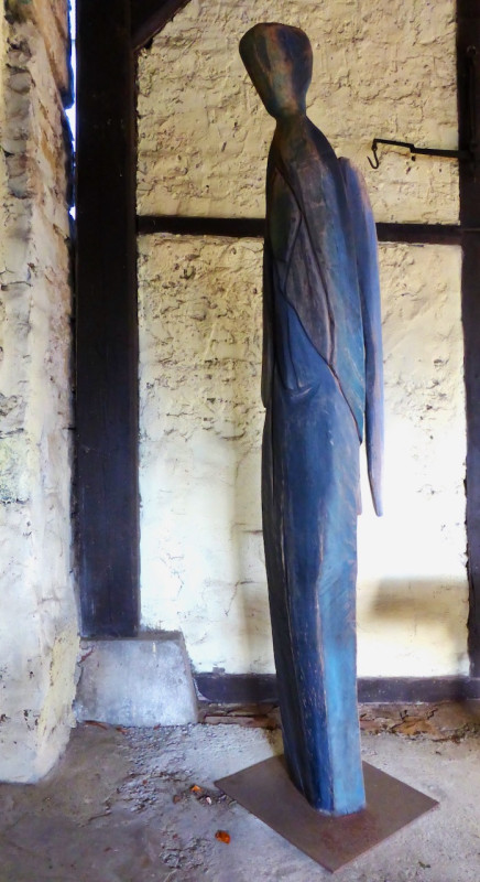 Aus dem Holz hiesiger Walnuss- und Kirschbäume gestalte ich mit der Kettensäge Stelen und Figuren, die mit den Bildern wiederum korrespondieren.